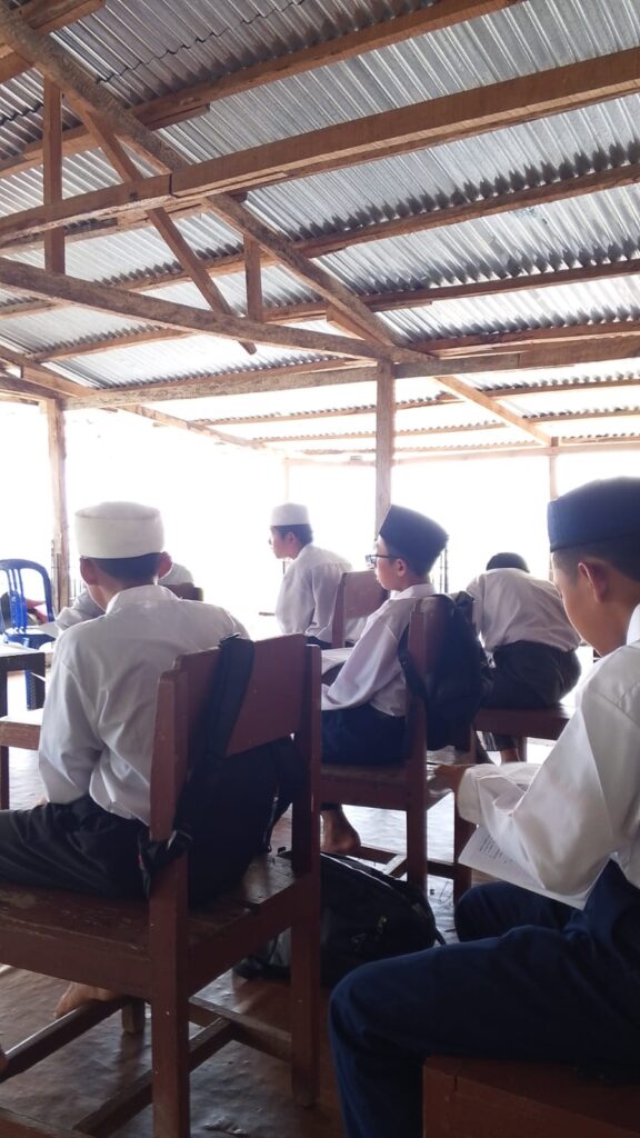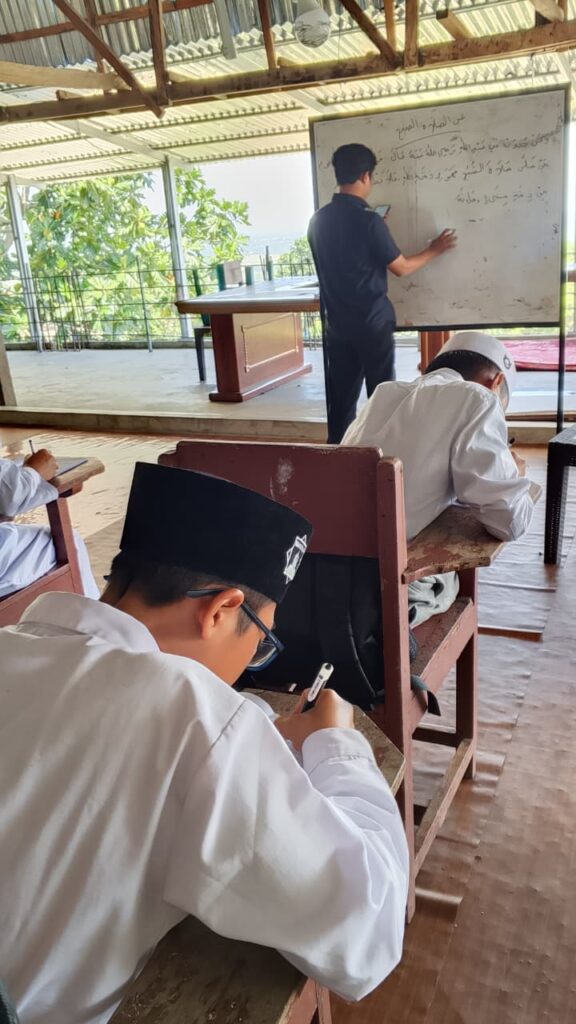 Selasa, 16 sepetember 2025, pukul 7.30 WITA, Seragam putih abu menggantikan gamis putih mereka, menandai waktu untuk pendidikan formal bagi para santri. Di lantai dua masjid beratapkan seng, ruang sederhana namun penuh makna menjadi tempat belajar, hari itu pembelajaran bahasa Arab/(mahfudzot) untuk kelas 7, kelas 8 Pembelajaran hadits, dan untuk kelas 9 di isi oleh pembejaran Bahasa Indonesia, Bangku-bangku kayu tertata rapi, menghadap panorama kota Makassar yang memukau, seolah menjadi saksi bisu semangat para santri dalam menuntut ilmu.