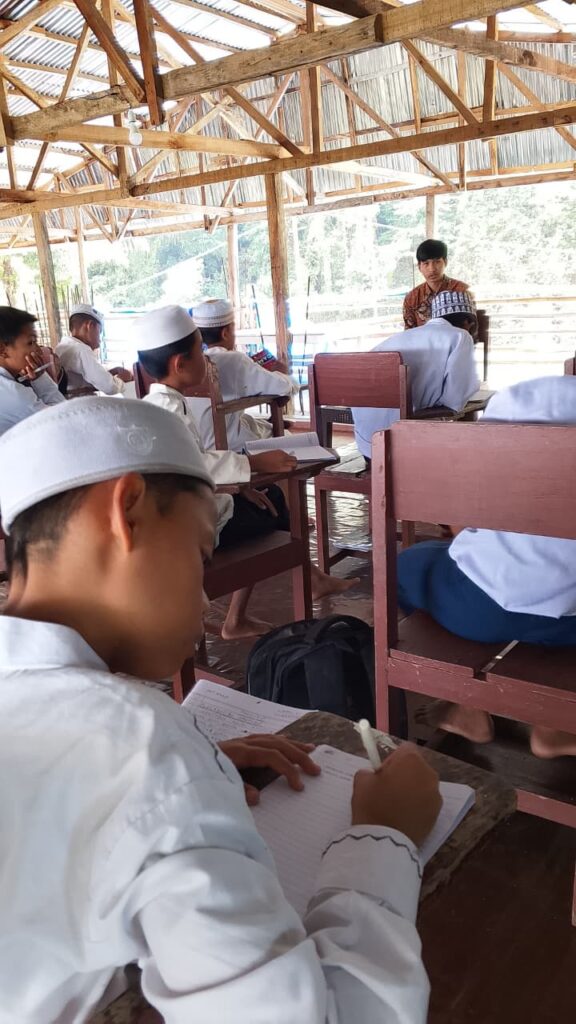 Pembelajaran bahasa Arab berlangsung dengan antusiasme tinggi. Meski ruang belajar ini bersifat multifungsi—menjadi tempat menghafal Al-Qur’an, berbuka puasa, hingga melepas lelah setelah aktivitas harian dan kenyamanan tetap terjaga. Para santri menunjukkan kedisiplinan dan rasa syukur yang mendalam, menjadikan keterbatasan sebagai pemicu semangat, bukan penghalang. Suasana belajar yang hangat dan penuh kekhusyukan menjadi bukti bahwa ilmu dapat tumbuh di mana saja, selama ada niat dan dukungan yang tulus.